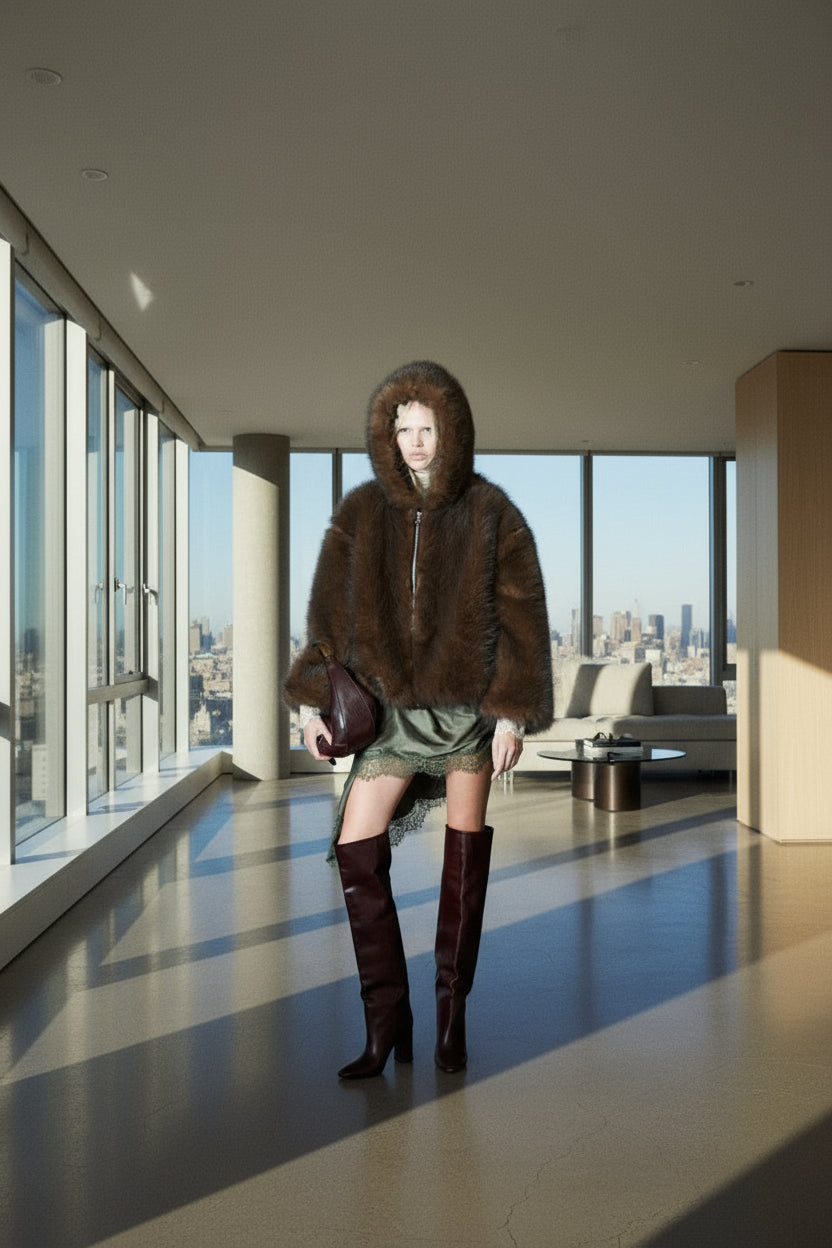Questa giacca in pelliccia sintetica marrone Lumina unisce eleganza e funzionalità. Dotata di cappuccio e pratiche tasche, garantisce comfort e calore nelle giornate più fredde. La cerniera frontale assicura una chiusura facile e sicura, mentre la vestibilità regolare offre un taglio versatile adatto a diverse silhouette. Disponibile in taglia unica, è una scelta sofisticata e responsabile per chi cerca stile e sostenibilità.